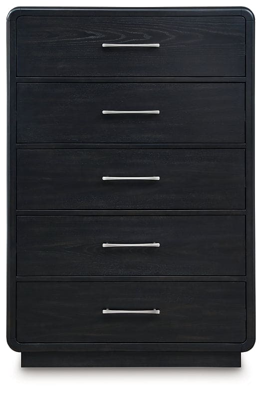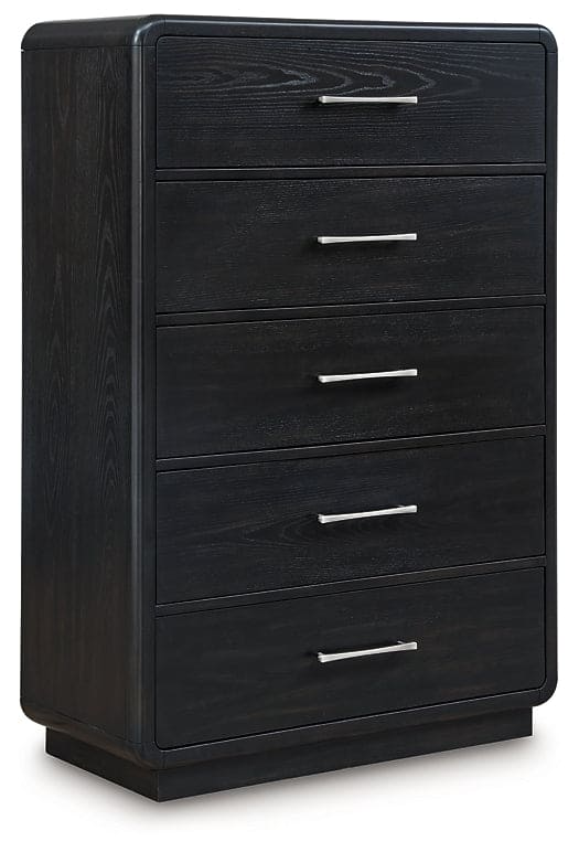 | Details | Made with hardwood solids and ash veneer, Black finish on textured wood grain surface, Burnished nickel-tone pulls, Waterfall edges, 5 smooth-gliding drawers with fully finished interior, dovetail construction and heavy duty ball-bearing side glides | |