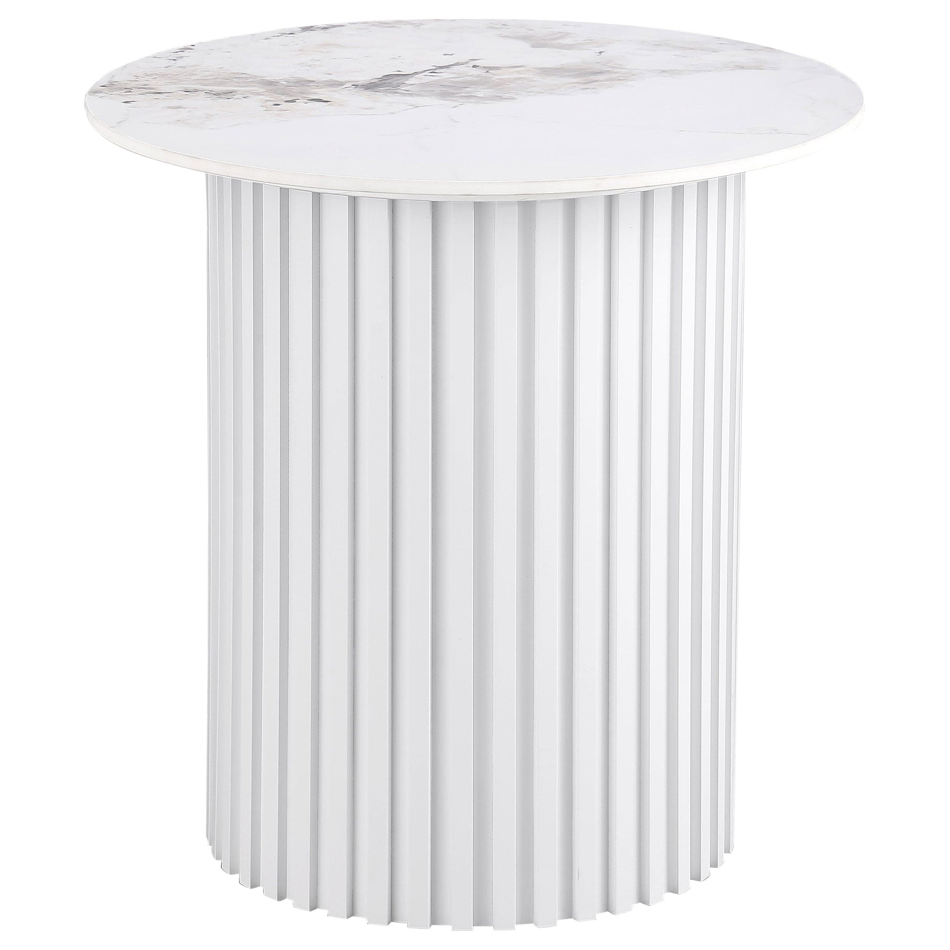 This coffee table set combines modern design with durable materials, featuring sintered stone tops with elegant veining for a sophisticated touch. Fluted metal bases in a white powder-coated finish provide sturdy support and cohesive style. Including a coffee table, and end / side table, this set offers versatility and functionality. Perfect for contemporary living spaces, it blends practicality with refined craftsmanship.
