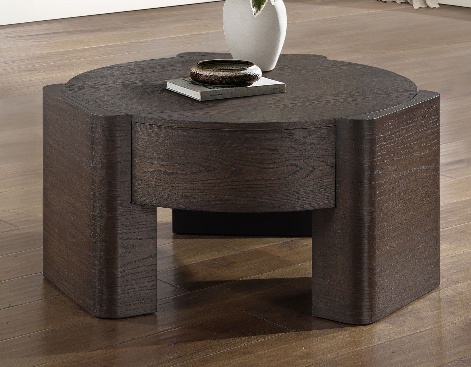 Modernly elegant with flowing round shapes, the Salina 3-Piece Table Set completes any room with stunning table accents. Crafted from oak veneers and solid Asian hardwoods in a warm espresso finish, the set includes a 32.5″ round coffee table with hidden casters and two matching end tables. The coffee table’s smooth top and built-in mobility let you whisk it out of the way effortlessly when needed. Each end table features clean lines and a lower shelf for display or storage. Sleek and versatile, Salina suits any modern or transitional space.
