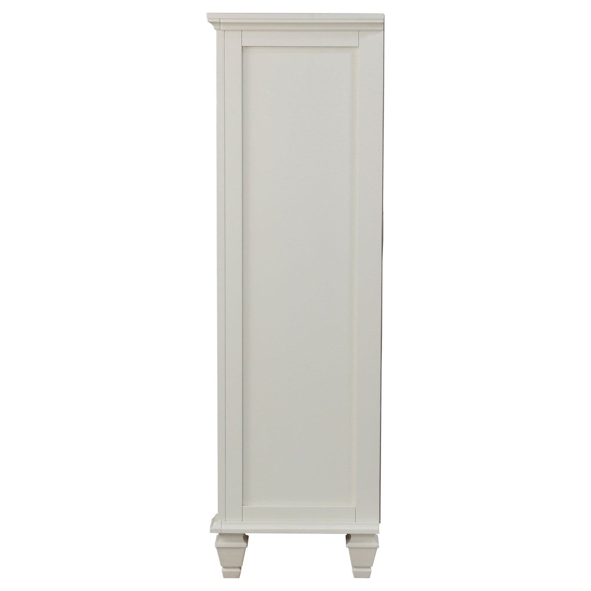 • Cabinet door opens to reveal additional drawers and shelving for organizing linens or accessories