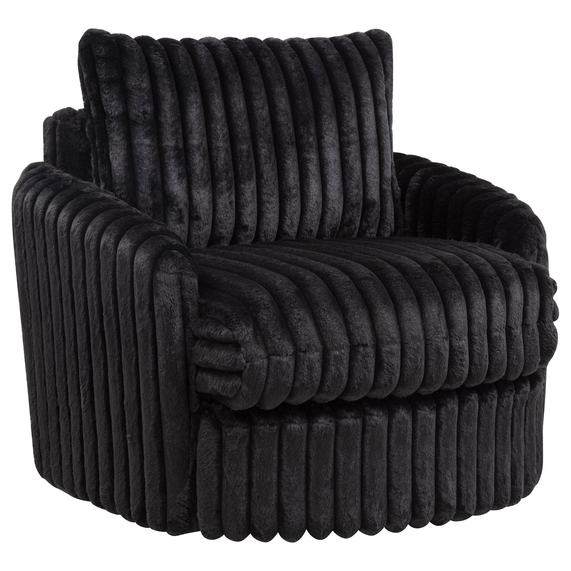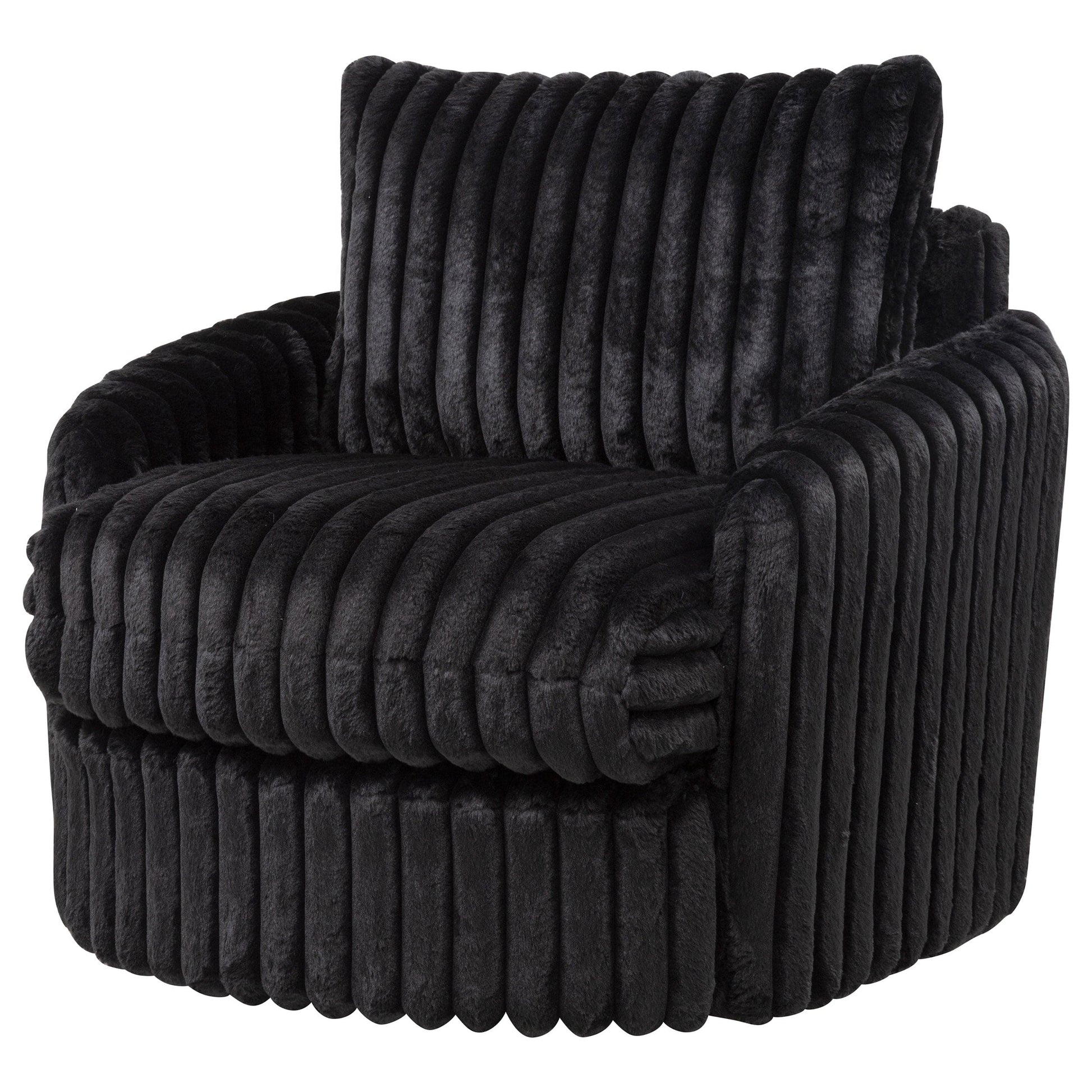 Contoured for comfort and wrapped in plush texture, this swivel chair invites relaxed movement with a soft, sculptural silhouette. Deep channel tufting traces every curve, from the wide seat to the tailored backrest and arms. Fully upholstered in ribbed corduroy and built with layered foam, this lounge chair rotates 360 degrees for flexible conversation. Ideal for modern living rooms, reading corners, or cozy bedrooms.