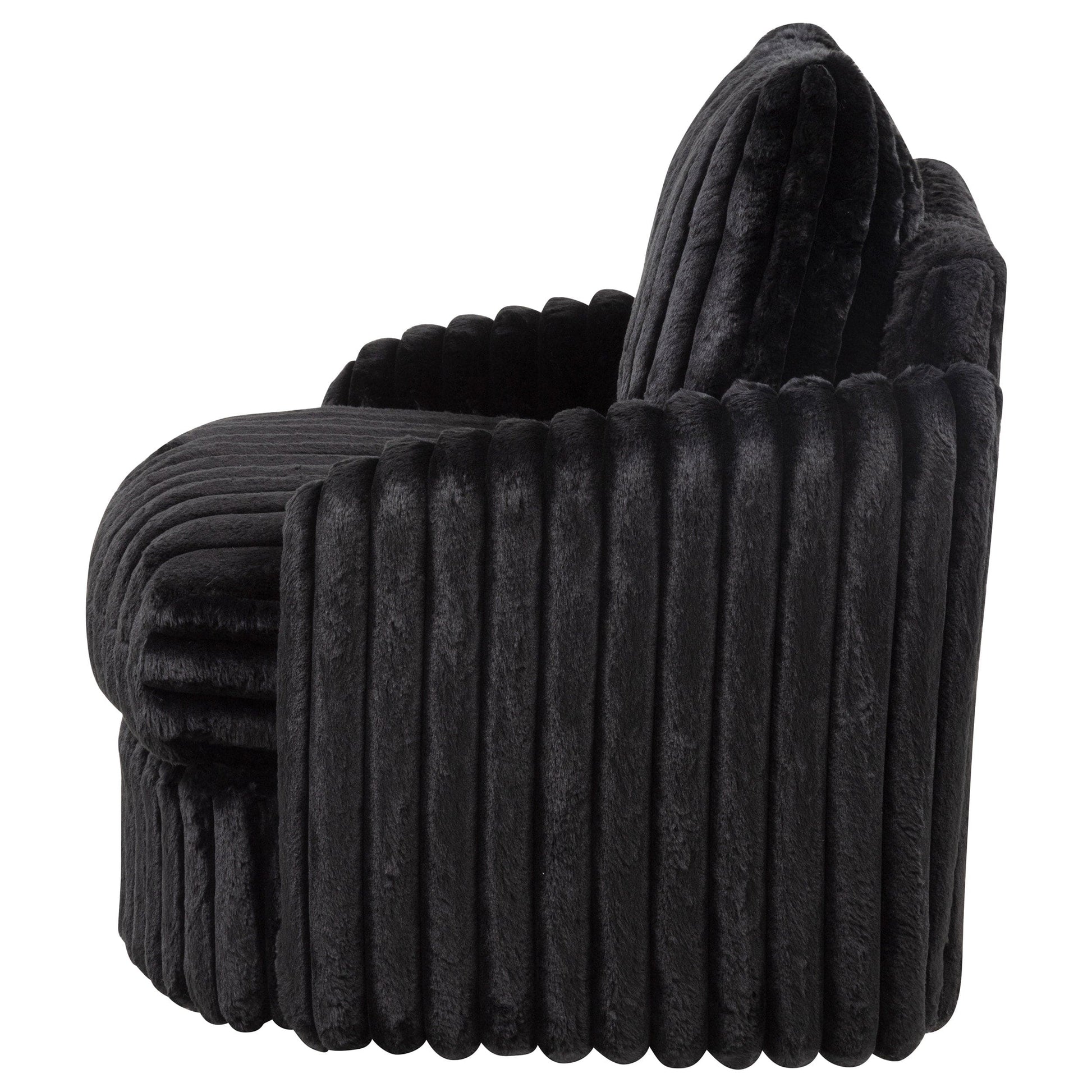 • Swivel chair in black corduroy features deep channel tufting and soft sculptural shaping