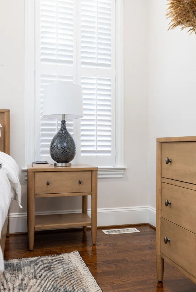 The Chatham Collection combines timeless elegance with thoughtful design. Finished in warm maple, the bed features a 45" headboard for ideal window clearance, complemented by soft return posts and dark pewter "cats eye" hardware. Felt-lined top drawers with jewelry trays, cedar-lined bottom drawers, and recessed side panels add luxurious touches. Nightstands offer modern convenience with USB/USB-C ports. A perfect blend of beauty, comfort, and practicality for any bedroom.