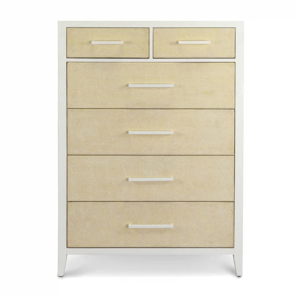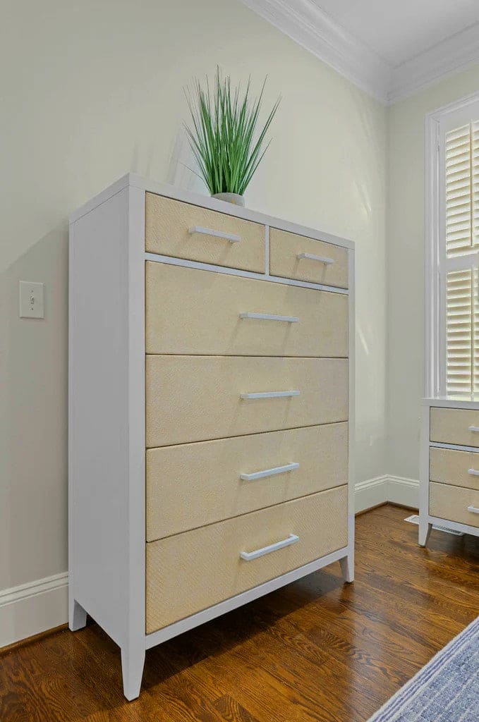Case is in Mindi Solids with a reflective white finish, fronts are an engineered woven giving a soft suede feel. Hardware features a powder coated metal pull, tapered legs finish the case.