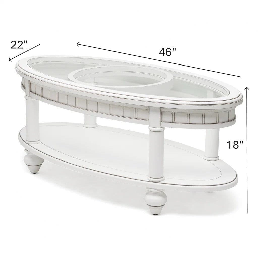 Add a timeless touch to your living room with the Monaco Oval Coffee Table, crafted from kiln-dried solid wood and finished in a light glaze and distressed, white-painted exterior. With easy assembly (all necessary hardware included) and a tempered glass top, this coffee table is a classic and stylish choice that will enhance any home.