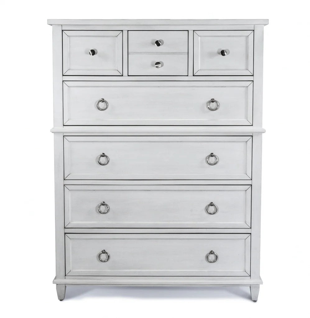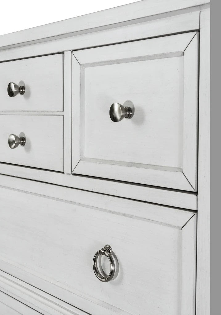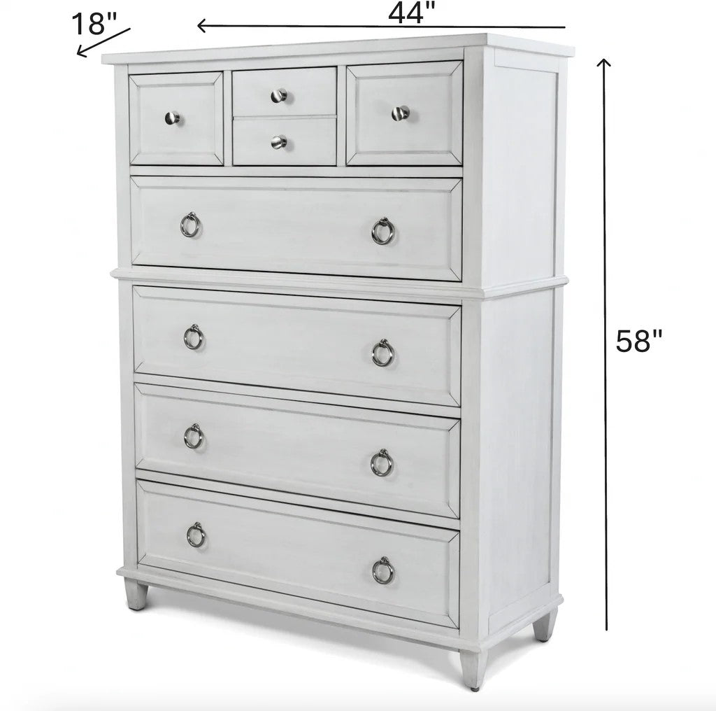 Cases are in poplar wood featuring mid-waisted molding. A 12-step brushed translucent white finish w/ soft grey glaze. Fronts are in birch with custom nickel ring pull hardware and back plate. Clean tapered legs support the cases, felt line top drawers with jewelry trays. Bottom drawers have cedar bottoms, all nightstands have power and USB/USBC.