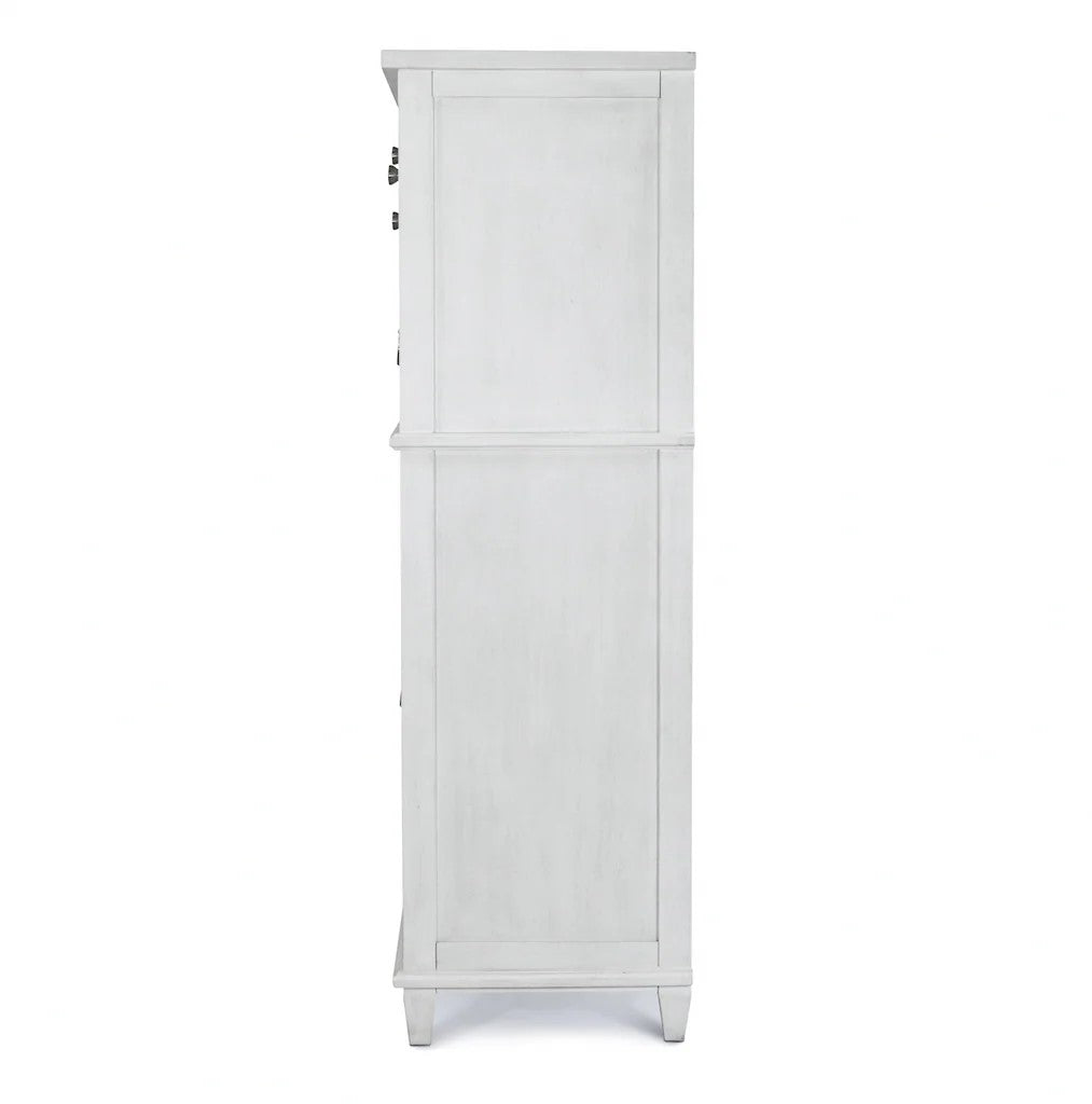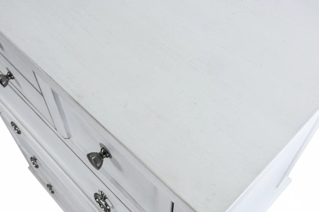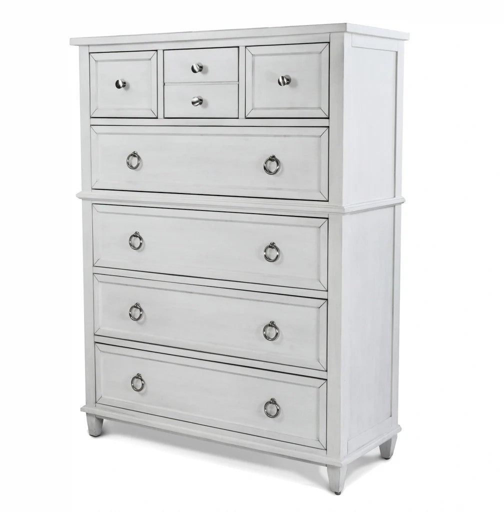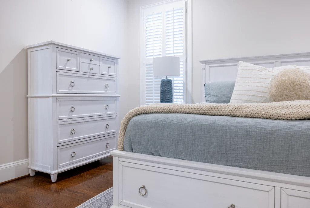 Cases are in poplar wood featuring mid-waisted molding. A 12-step brushed translucent white finish w/ soft grey glaze. Fronts are in birch with custom nickel ring pull hardware and back plate. Clean tapered legs support the cases, felt line top drawers with jewelry trays. Bottom drawers have cedar bottoms, all nightstands have power and USB/USBC.