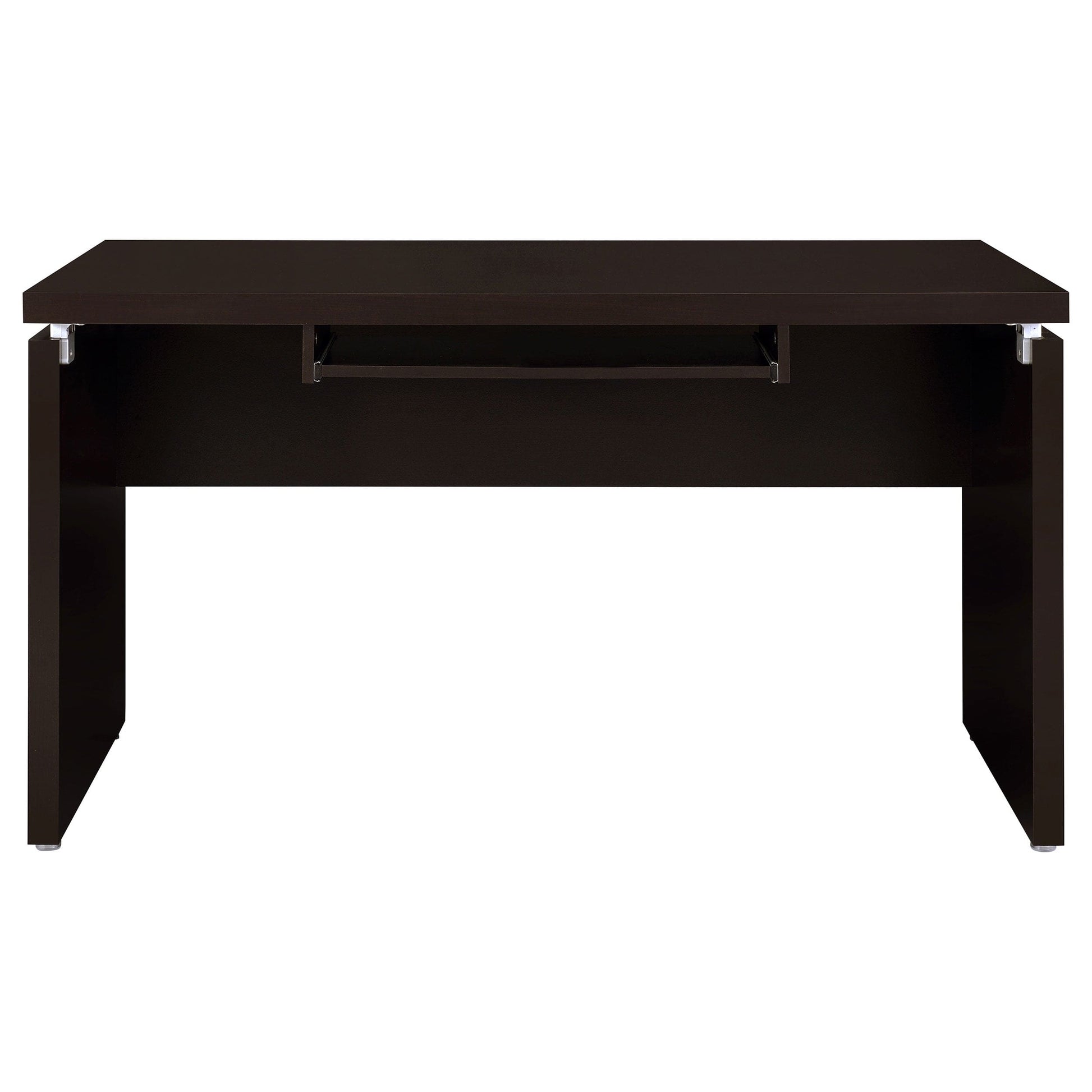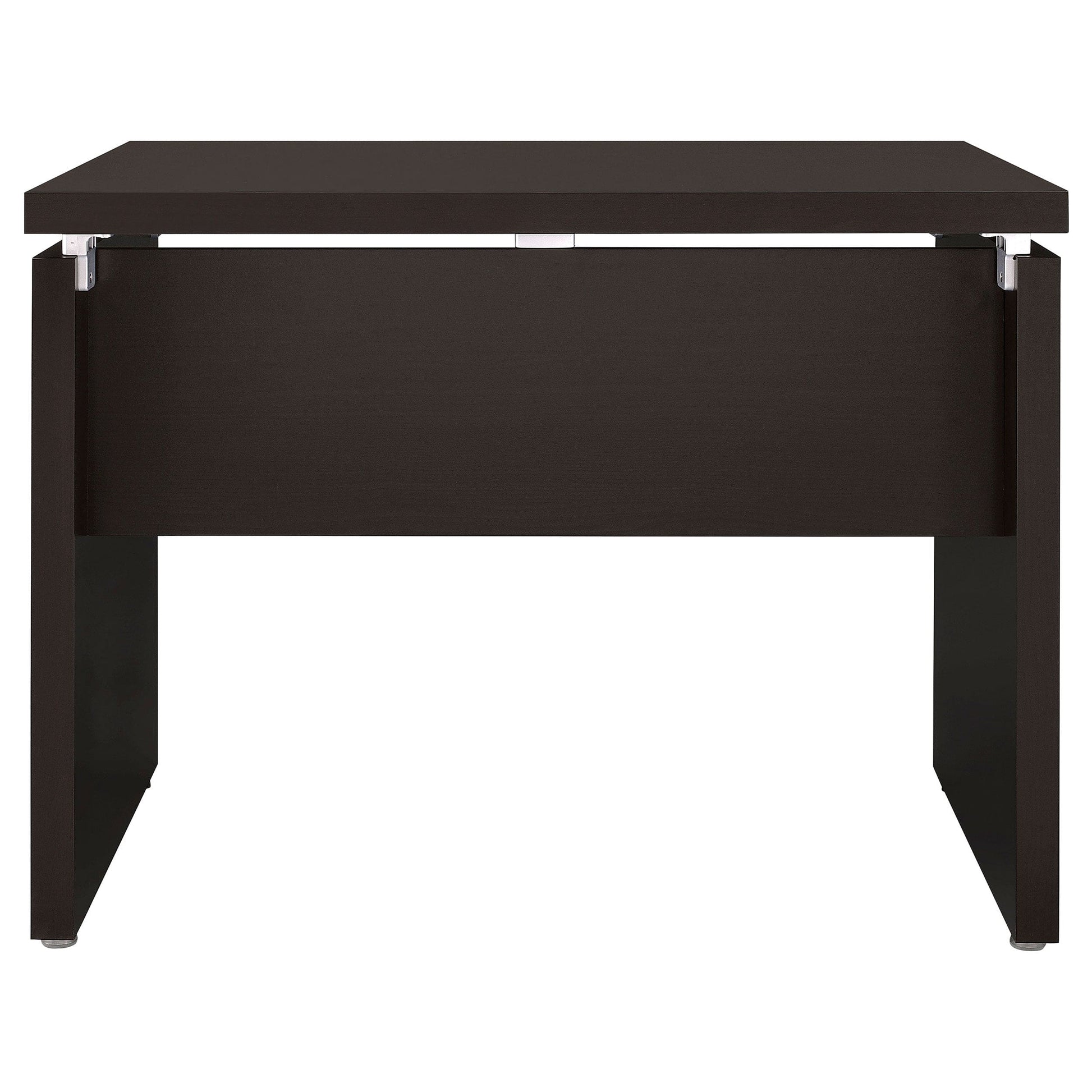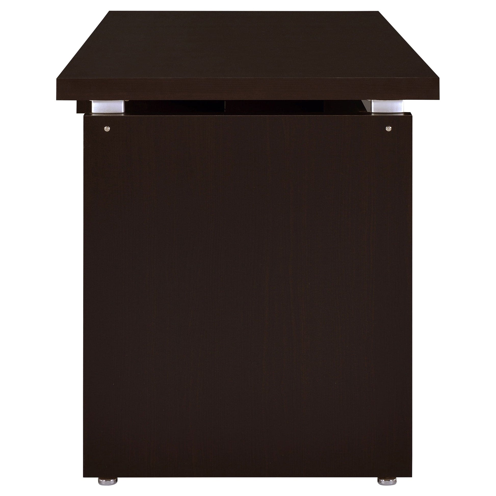 Silver hardware gleams in a modern L-shaped desk. Ideal for working from home, the desk is a spacious design complete with plenty of storage. A slide-out keyboard tray adds ergonomic appeal while multiple accessory drawers keep you organized and your desktop tidy. A rolling fil drawer provides a place for paperwork and documentation while a slim shelf space is ideal for notebooks or a reference book. A cappuccino finish is rich and elegant, offering modern flair that blends beautifully in your workspace.
