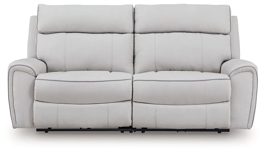 Smart, clean and ultra modern, this power reclining sectional is utterly in vogue. You'll love its indulgent cushions and contemporary bustle back styling. The sumptuous fabric, accentuated with contrasting welting, easily blends with your decor. And with reclining at the press of a button, this modular sectional proves chic design and superb comfort go hand in hand.