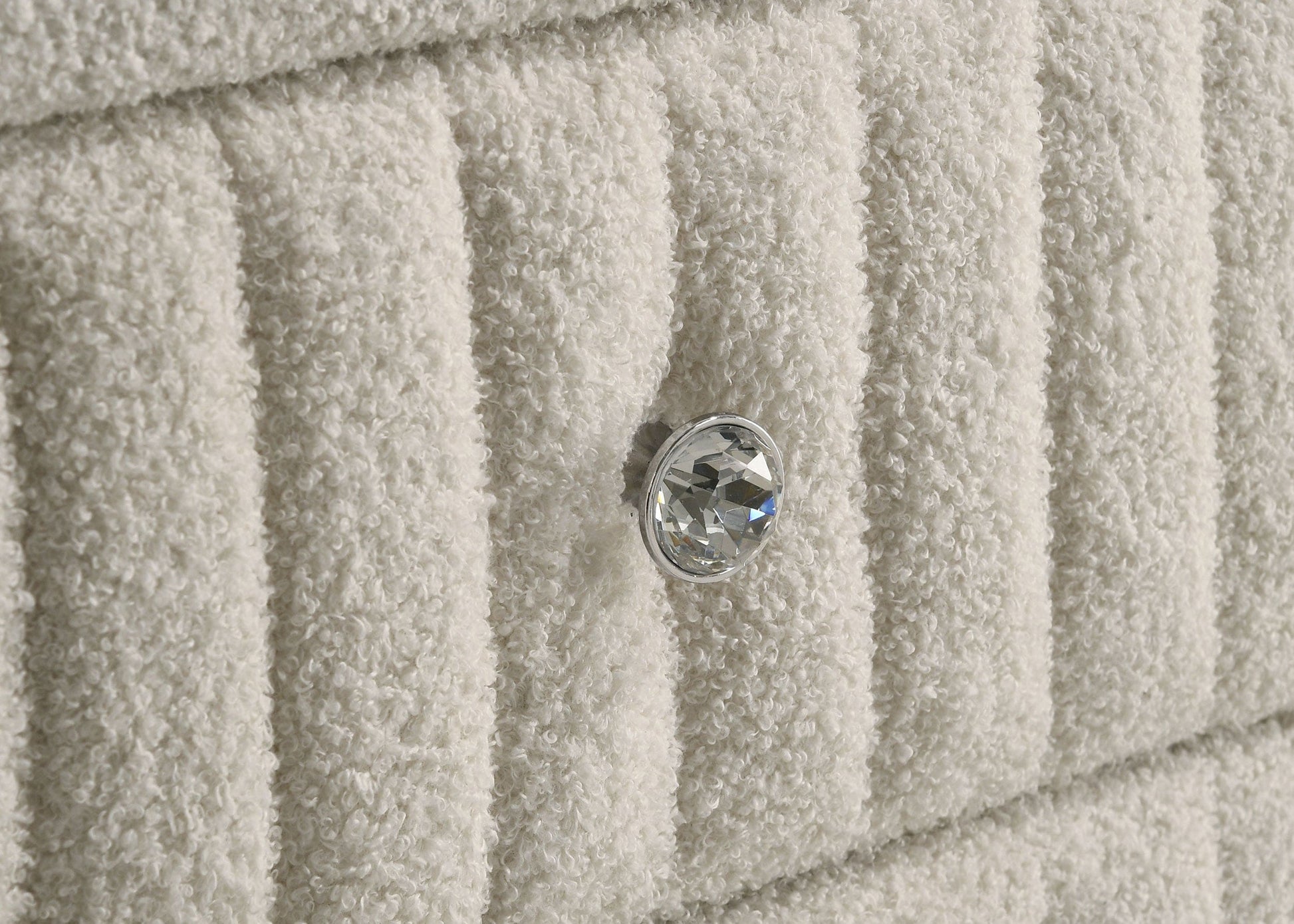 Wrapped in a cloud of boucle and gleaming detail, this dresser and mirror set transforms any bedroom into a personal sanctuary. Diamond tufting along the sides sparkles with embedded crystal accents, while vertical channeling on each drawer adds tailored rhythm and depth. Topped with a sleek mirror framed in matching fabric, the design offers a romantic balance of softness and structure, inviting both elegance and indulgence into everyday routines.