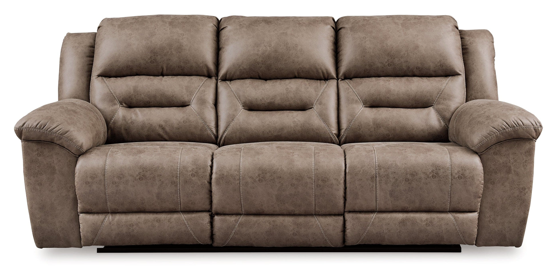 For those who love the cool look of leather but long for the warm feel of fabric, this reclining sofa delivers both with ease. Its high-performance padded faux leather is remarkably durable and easy to clean, making it just the thing for family spaces. Channel-stitched back cushions provide indulgent lumbar support for maximum comfort—not to mention fashion-forward flair.