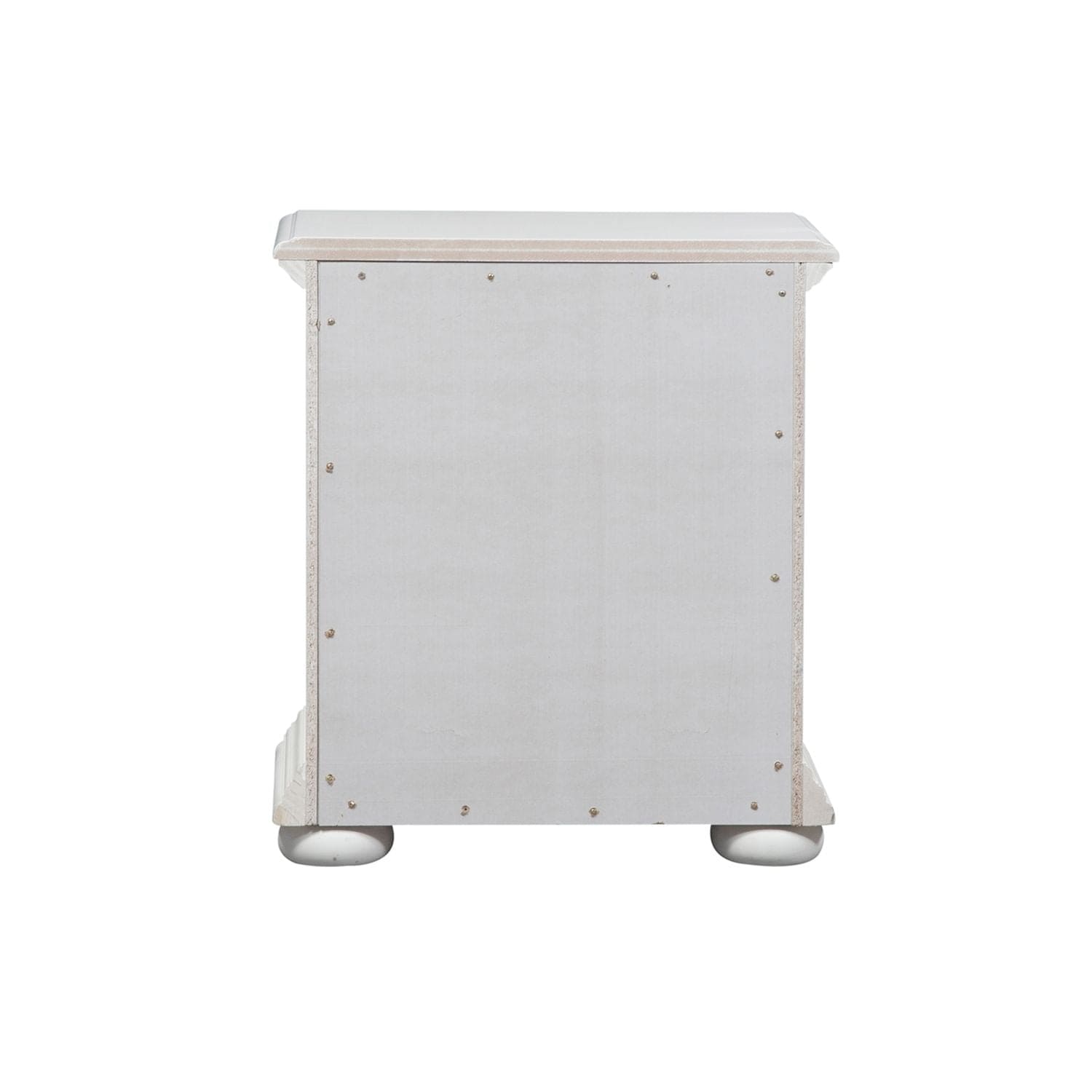 Obtain a fashionable cottage look with this 2 drawer night stand. The oyster white finish is accented by wooden knob hardware. This piece is crafted of pine solids with painted MDF, and features fully stained interior drawers, a bottom drawer with a laminate bottom, full extension metal drawer glides for easy access to storage, and bun feet. Storage abounds with the felt lined top drawer and bottom case dust proofing.