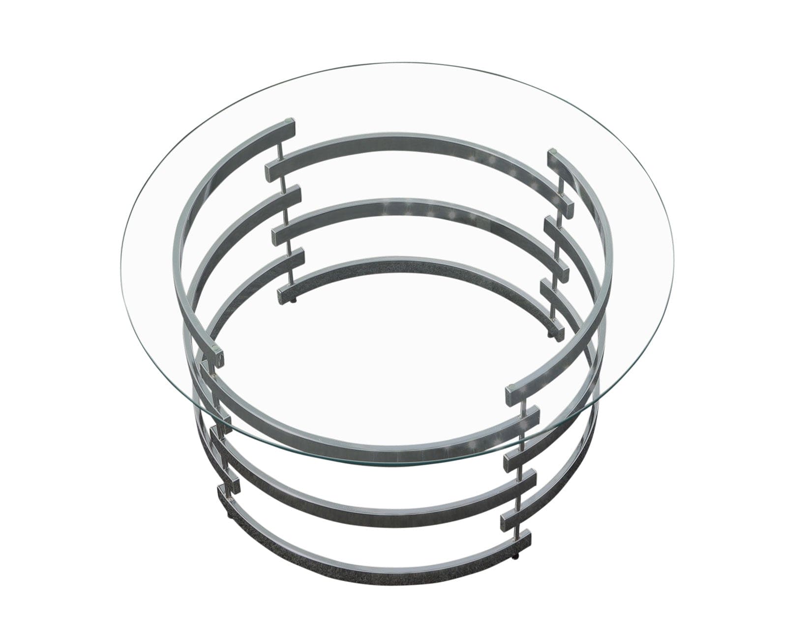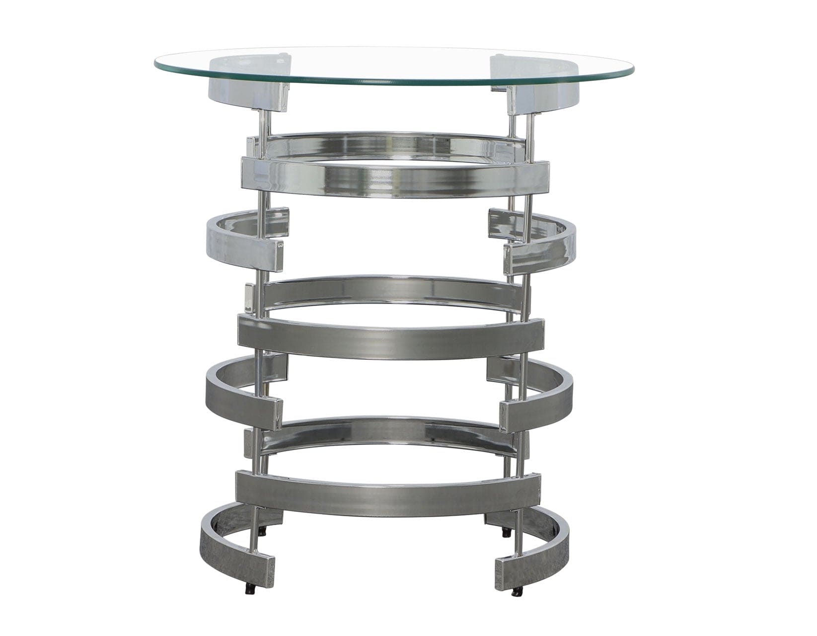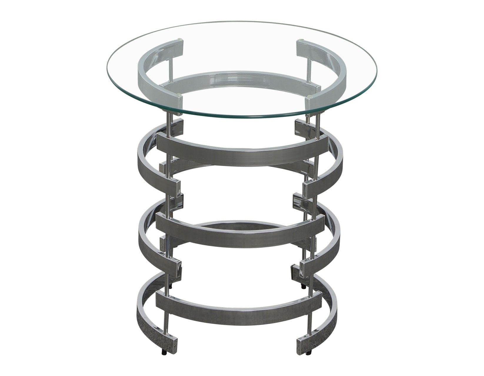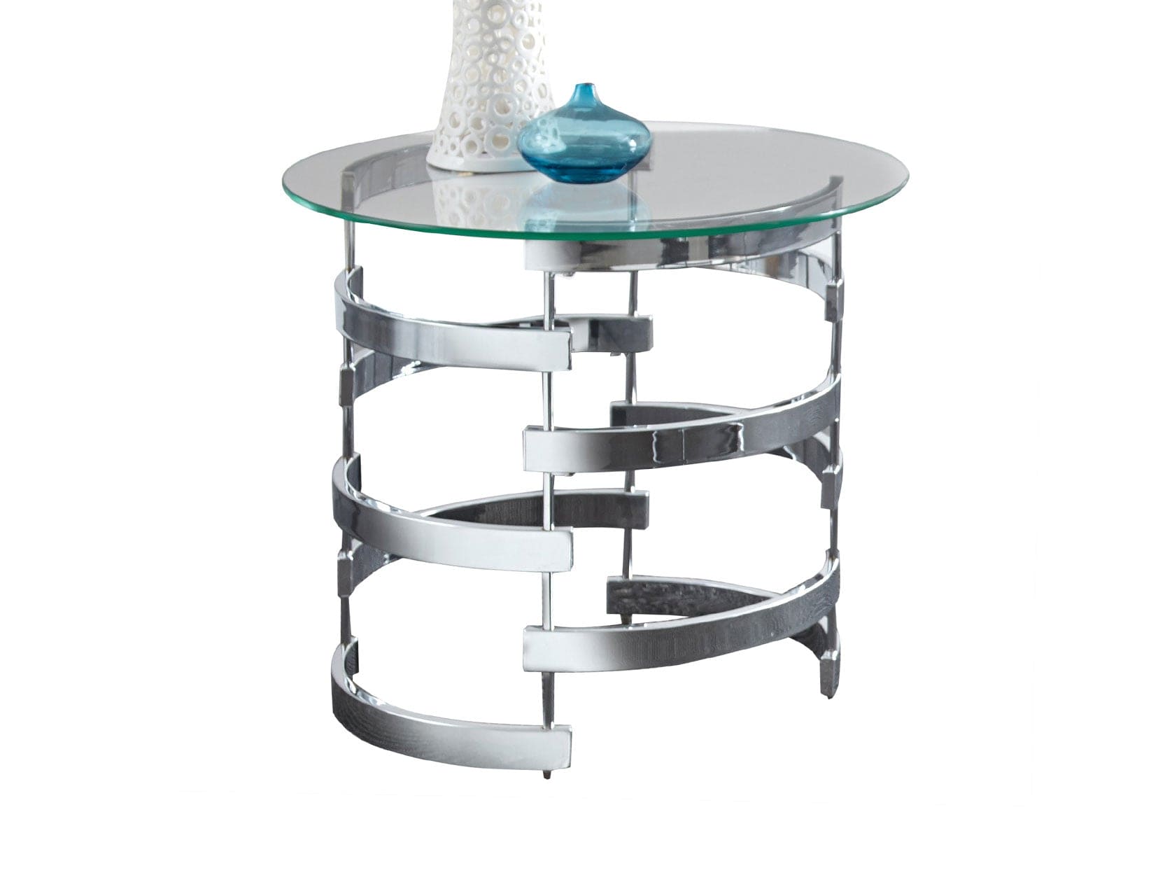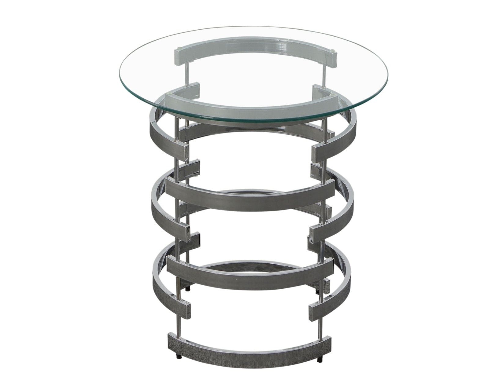 Give your room an artistic flair with the Tayside ! The contemporary collection in chrome is plated metal with glass tops. Shaped bands of metal stack to form a circular base. Lay-on 12mm tempered glass top has a polished edge for a clean silhouette.