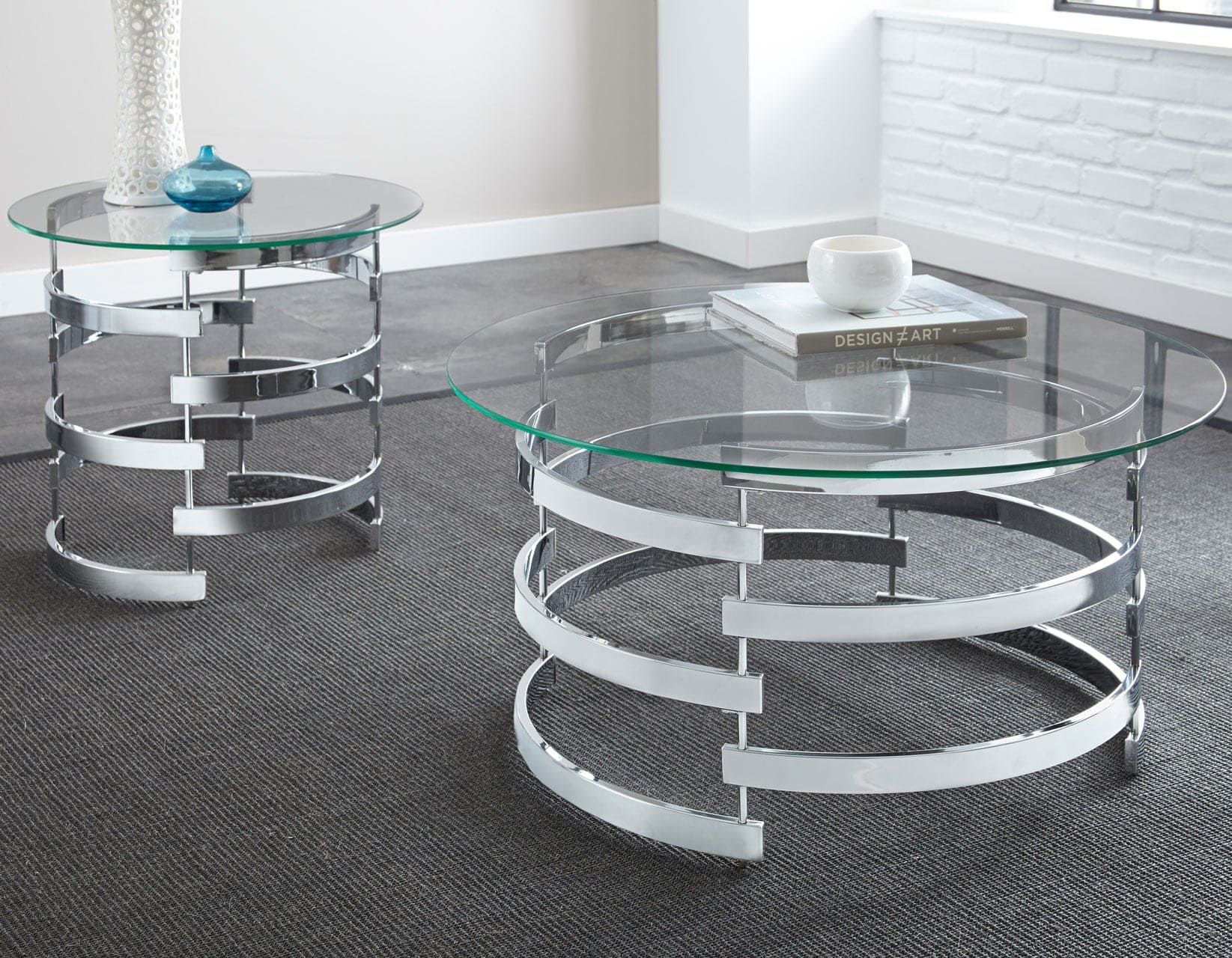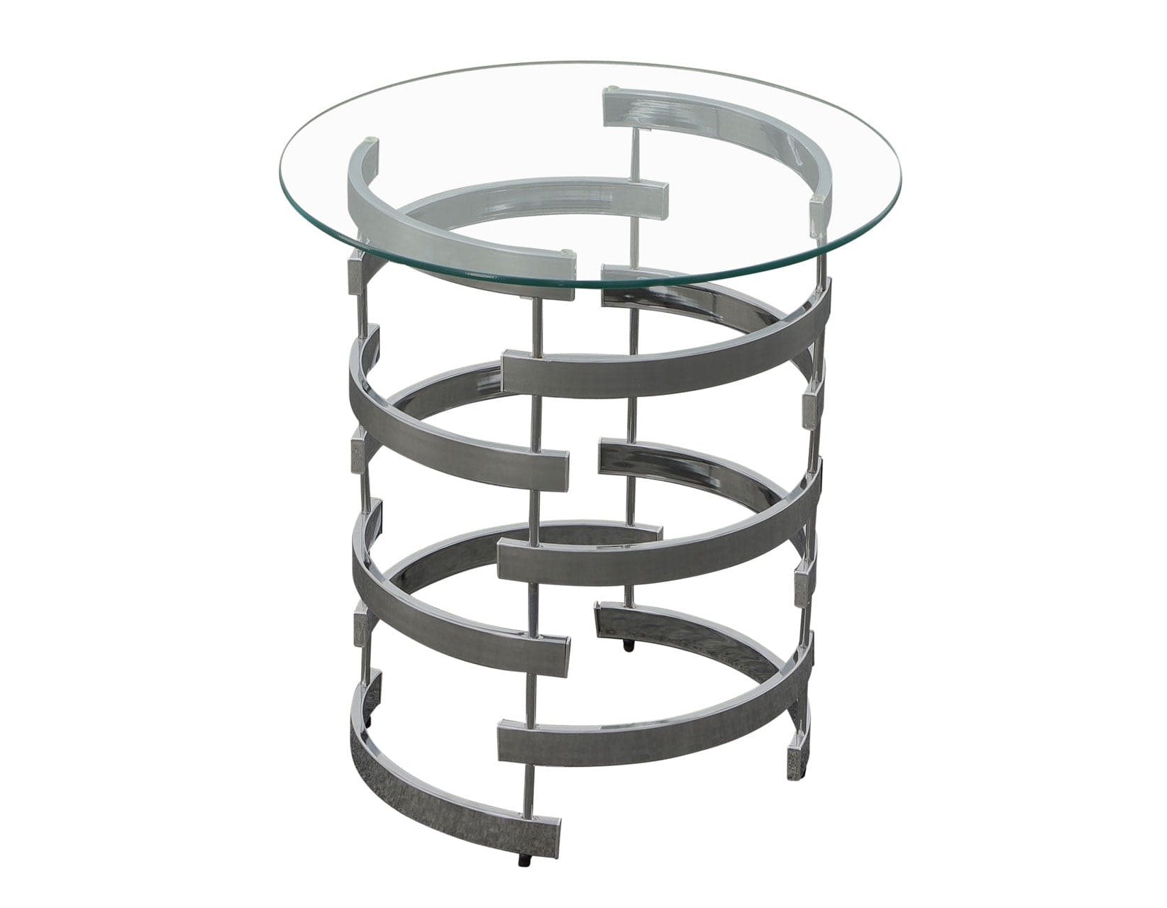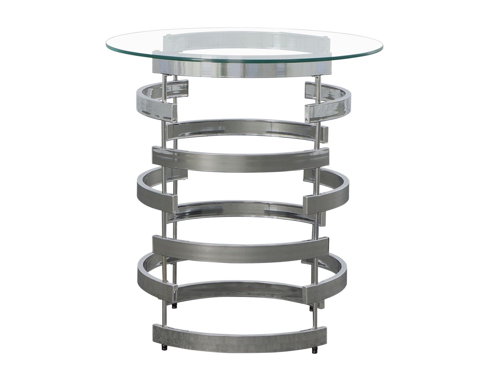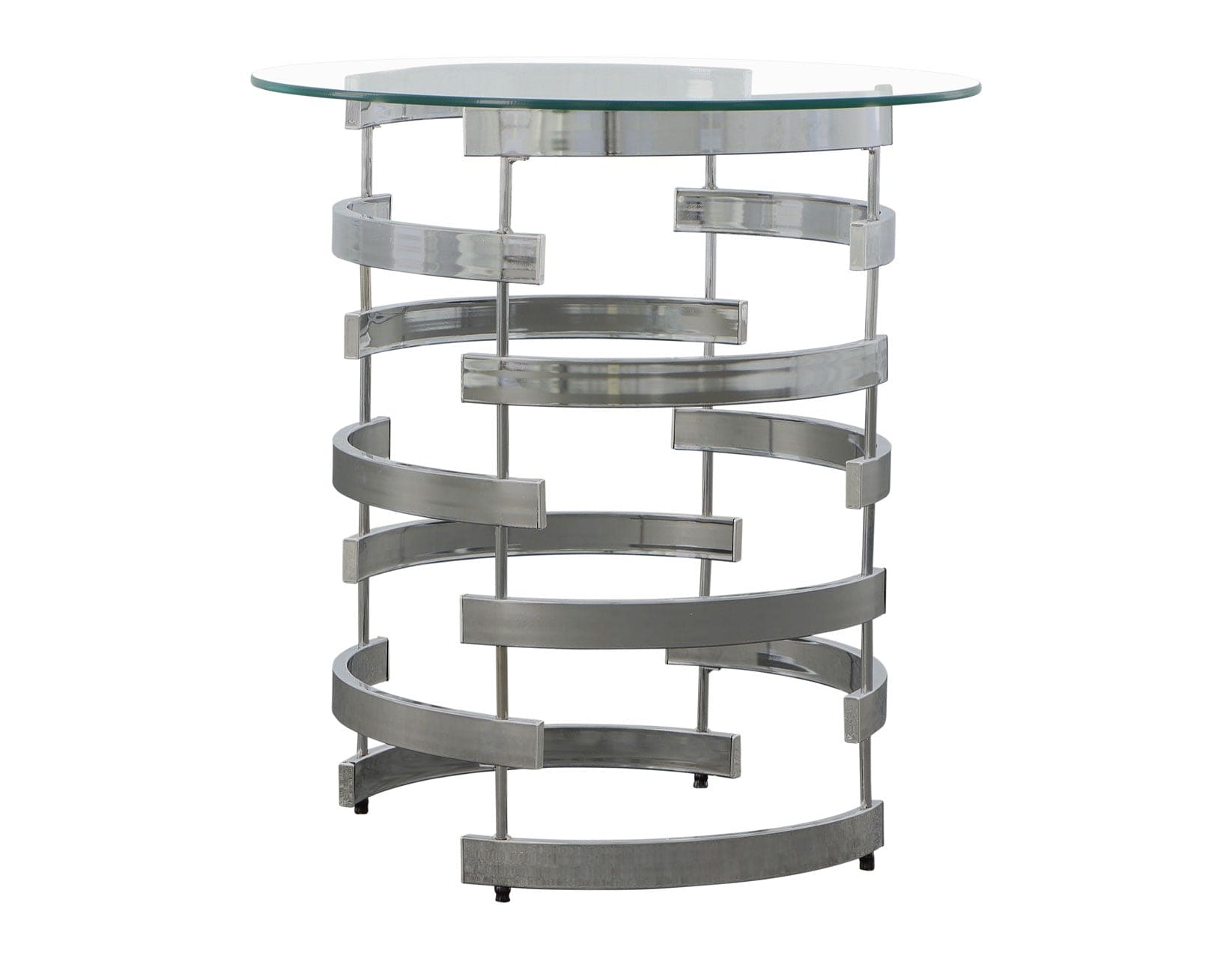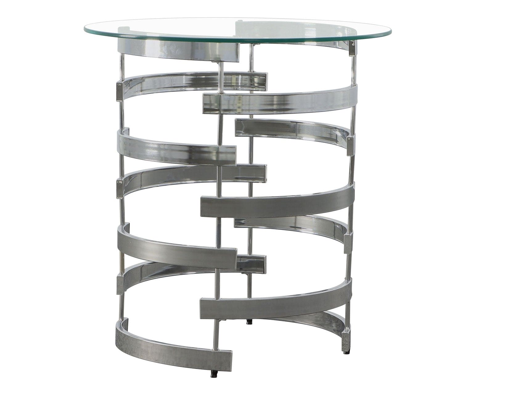 Give your room an artistic flair with the Tayside ! The contemporary collection in chrome is plated metal with glass tops. Shaped bands of metal stack to form a circular base. Lay-on 12mm tempered glass top has a polished edge for a clean silhouette.