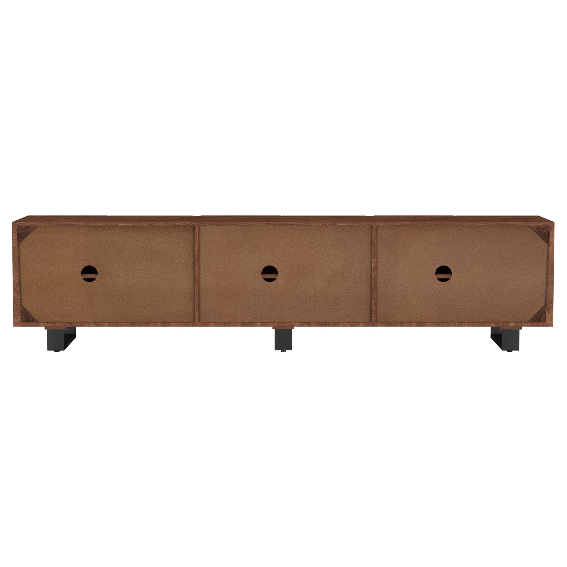 This spacious TV stand is crafted from solid mango wood, offering ample storage with its six doors and adjustable shelves. The mango brown finish highlights the natural beauty of the wood grain, giving it a warm and timeless look. Curved panel details on the doors add a modern touch, while interior shelves provide versatile organization options. Supported by sturdy metal legs, the sideboard blends rustic charm with industrial durability, complete with cable cutouts for media management.