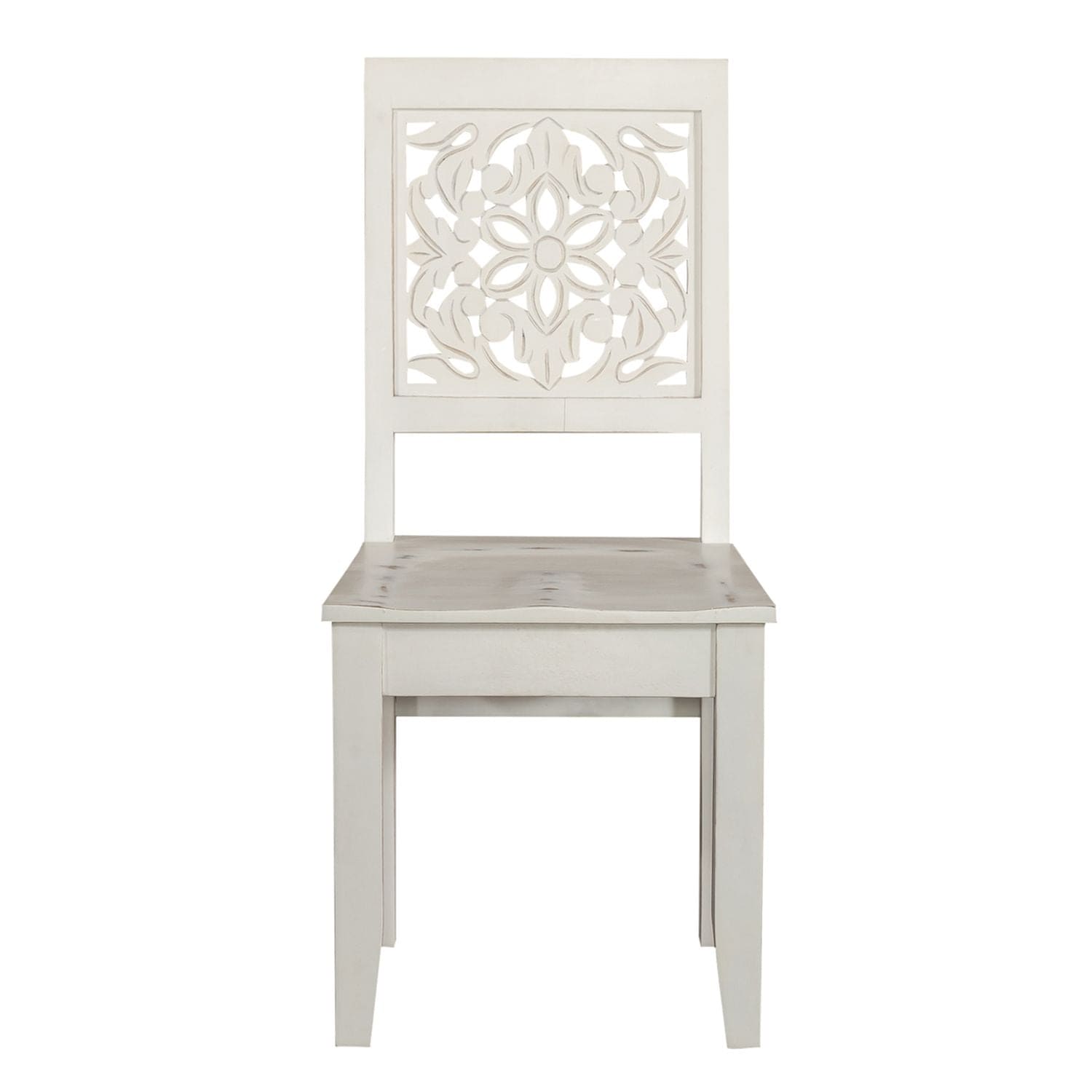 The Boho inspired Trellis Lane accent chair will make your room both functional and stylish. Crafted of solid mango in a weathered white finish with brown rub thru. Features artisan hand carved chair back, saddle shaped seat and blocked tapered legs. Add the accent writing desk and bookcase to complete your look.