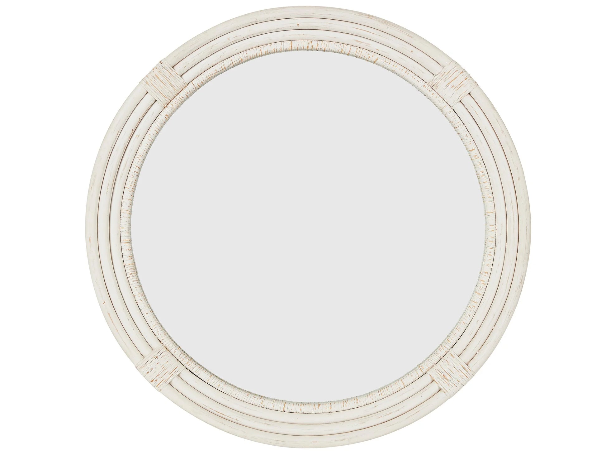 Reminiscent of knotted nautical ropes, the Getaway Round Mirror is a versatile accent piece, featuring layers of circular rings in a distressed finish.