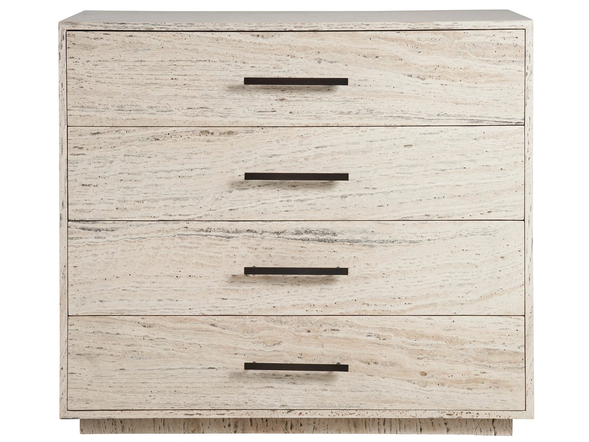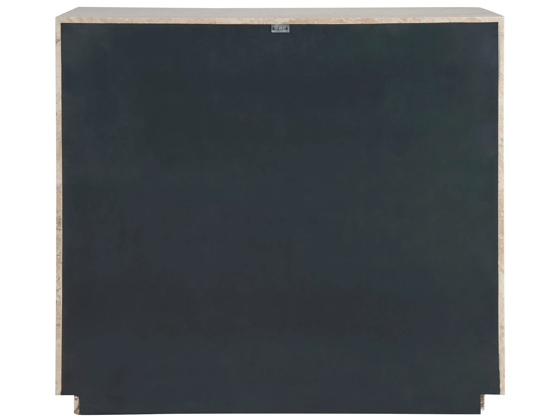 The Dove Drawer Chest, with its quartet of drawers, showcases the exquisite uniqueness of White Travertine, alive with vibrant textures and distinct markings. Dark bronze hardware accentuates its depth, elevating the chest to a piece that not only stores but also mesmerizes, blending effortlessly into spaces that celebrate sophisticated layers and natural elegance.
