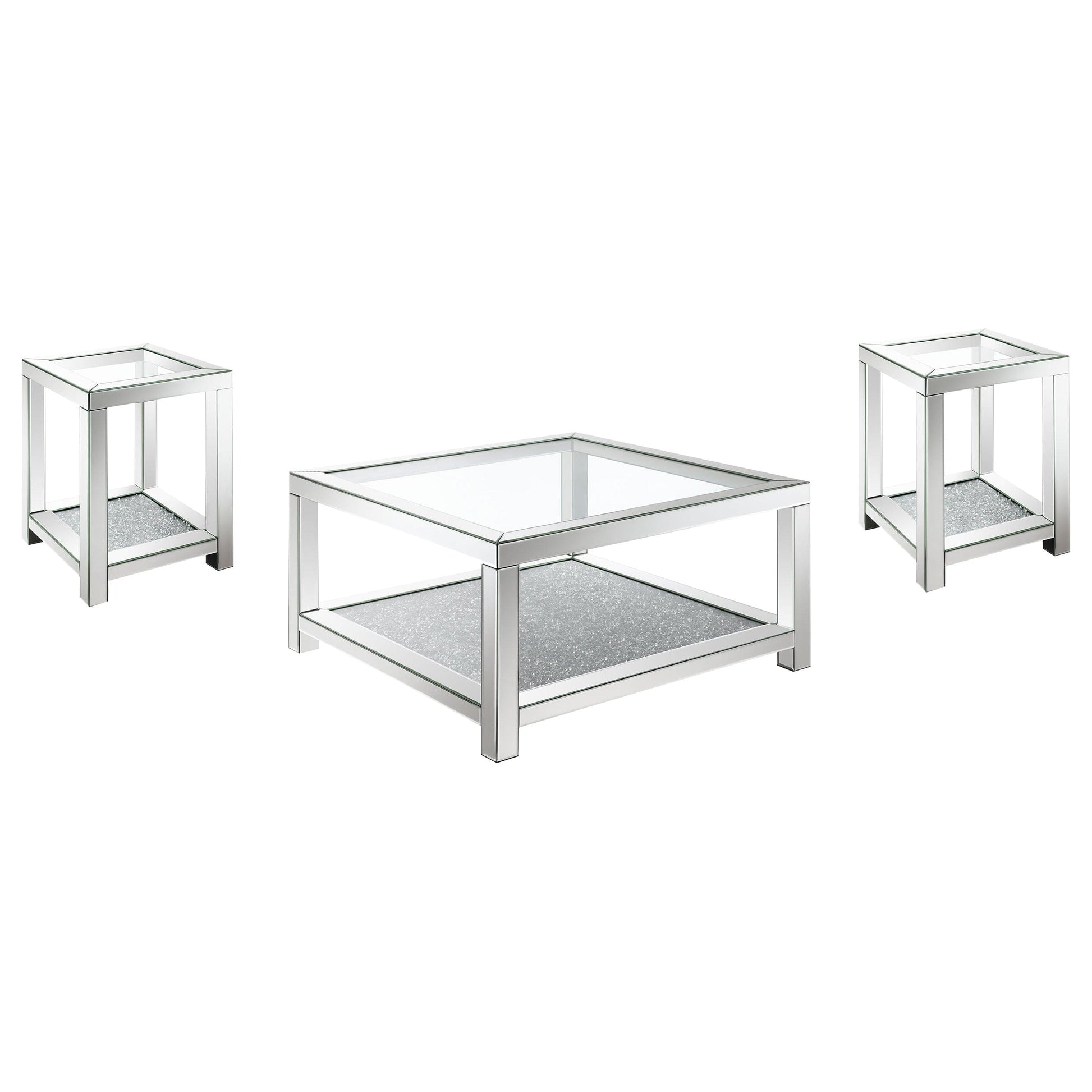 Transform your living space with this glam mirrored coffee table set. Featuring mirrored frames with beveled mirror trim and tempered clear glass tops, these pieces exude modern flair and Hollywood Regency vibes. The sparkling acrylic jewel-encrusted bottom shelves add a dazzling touch, while the mirror tile accents elevate their chic, refined design. Perfect for glamorous interiors, this set offers a blend of luxury and functionality.