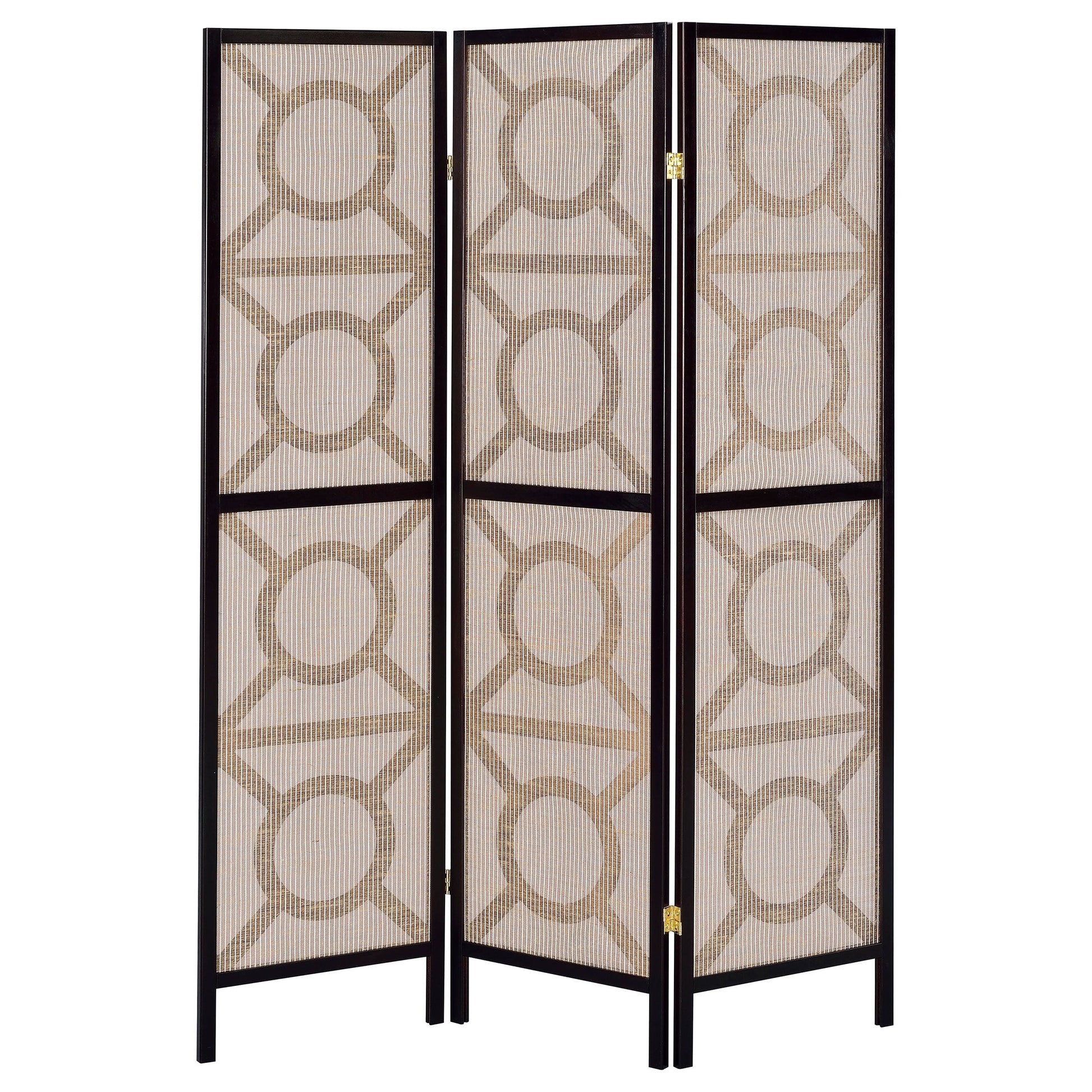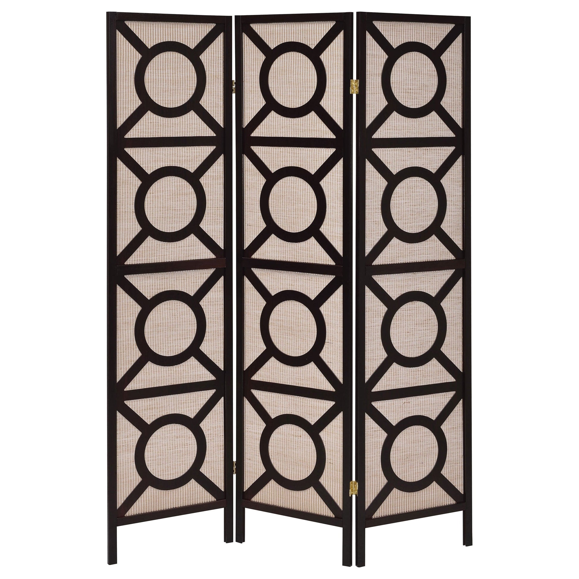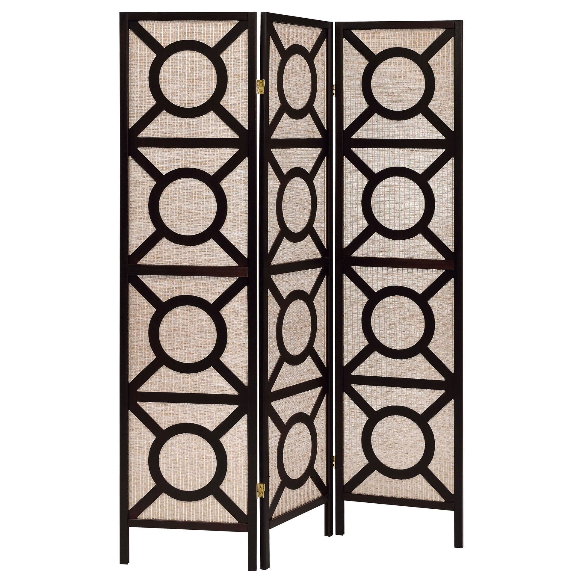 Riveting design detailing lends a dramatic effect. Make this three-panel folding screen a part of accent decor. Perfect for a transitional space, its open cutout design offers character and exotic charm. Circles and lines join to create an optically fun concept in a beautiful cappuccino and tan finish. Divide sections of a room or place in a corner as a decorative accent.
