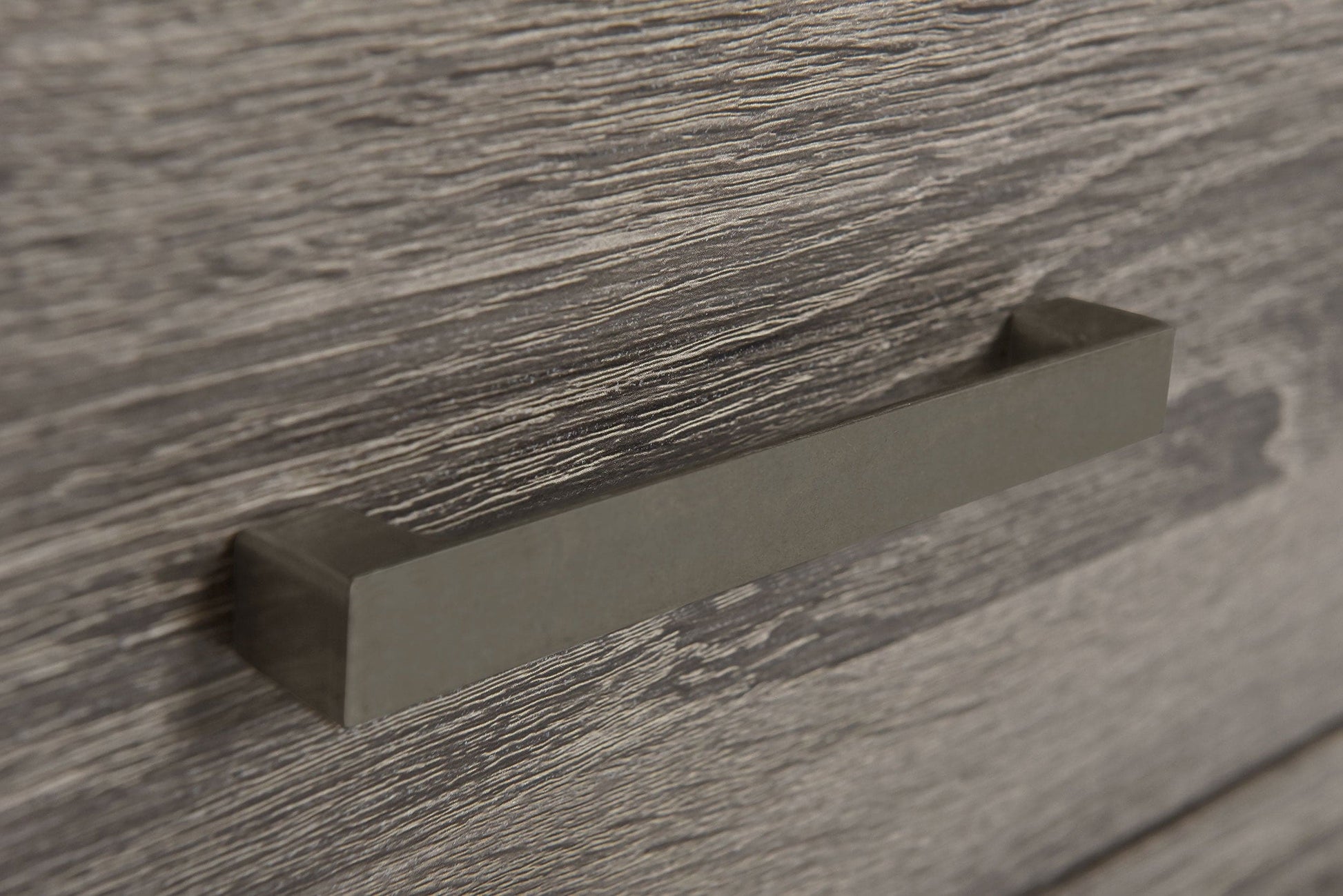 • A brown oak wood grain finish is complemented with metal bar handles that add a touch of contrast