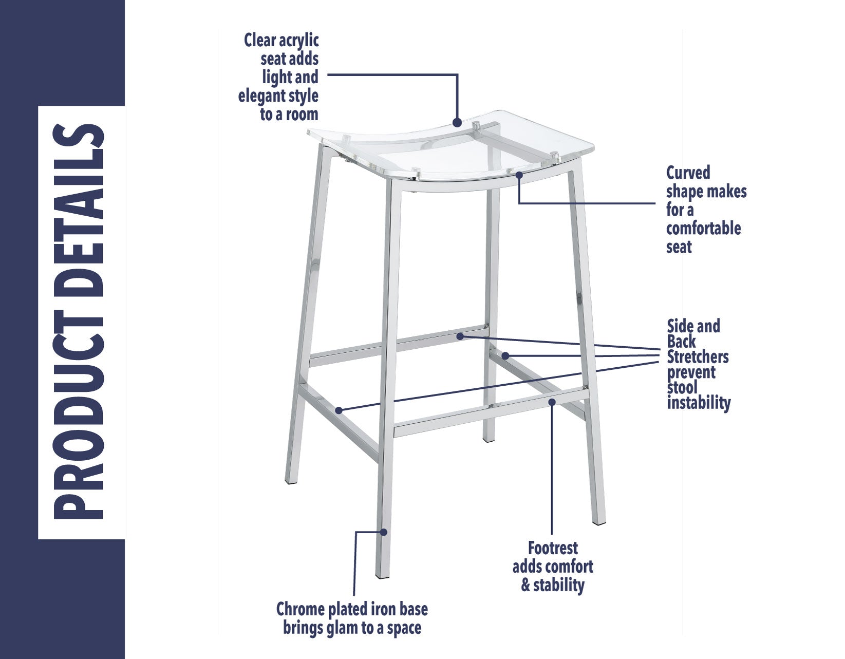 The Zena 29-inch Backless Bar Stool offers a seamless blend of style and durability, perfectly suited for 42-inch tall counters. This stool is more than just a seating option; it’s a statement piece. Its sleek, curved acrylic seat stands out with its clear profile, adding a light and modern touch to any space while allowing the gleaming chrome base to shine. The stool’s solid iron base is not just about aesthetics; it’s a testament to strength and longevity. Reinforced by side stretchers and a robust front footrest, this stool promises stability and years of dependable use. Whether paired with the Zena Bar or placed at your kitchen counter, this bar stool is guaranteed to elevate the look of your space.