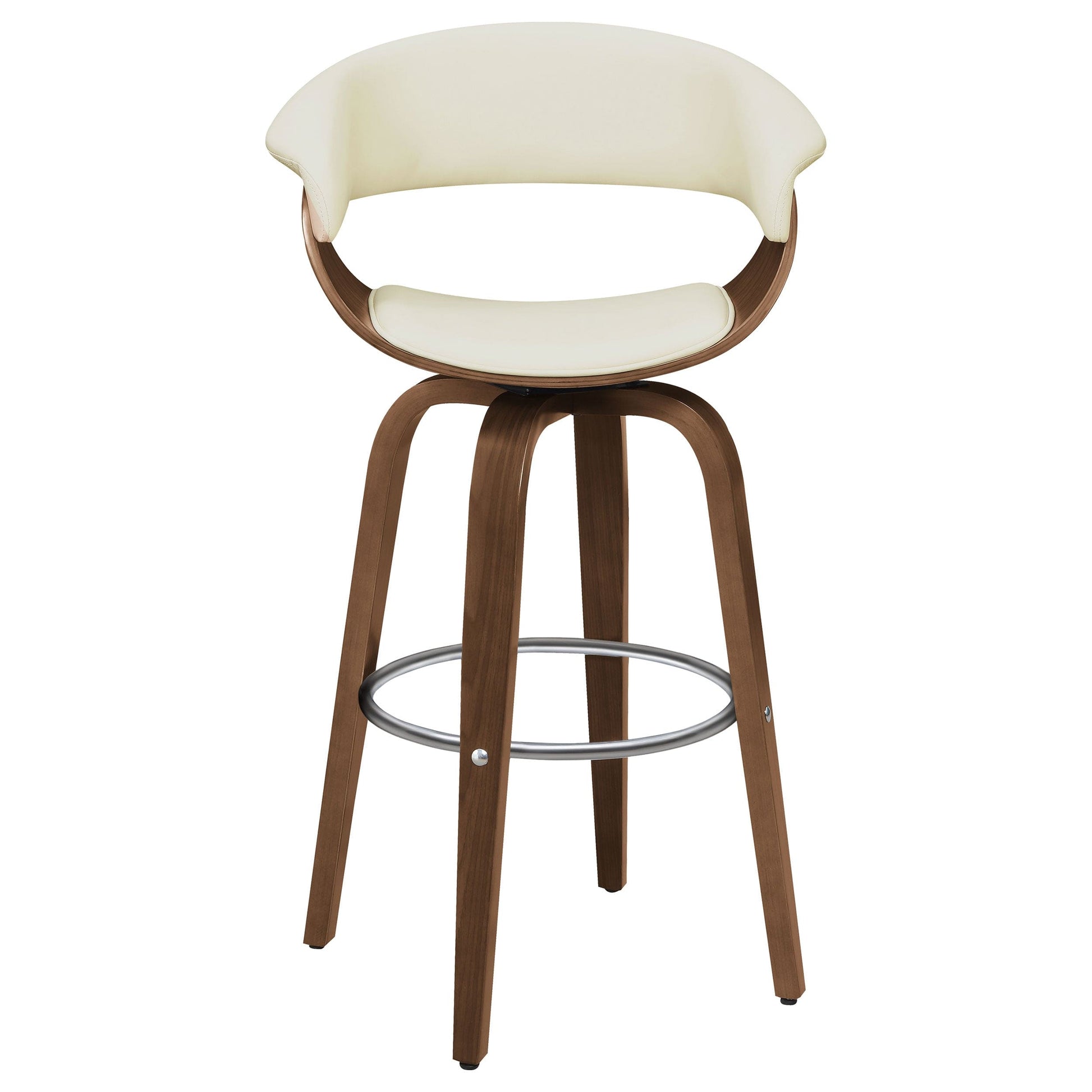 Upgrade your home bar's seating arrangement with the cool, classic comfort of this transitional bar stool. Soft, muted shades of walnut and white make it a perfect match for a variety of color schemes and decor styles. Its ergonomic design provides comfortable back and foot support for added relaxation, while convenient swivel seating allows for extra ease of movement. Its foot base boasts a beautiful chrome finish, rounding out its pleasing appearance with an unexpected hint of shine. This handsome barstool is an excellent choice for any host who wants to make their guests feel at home.